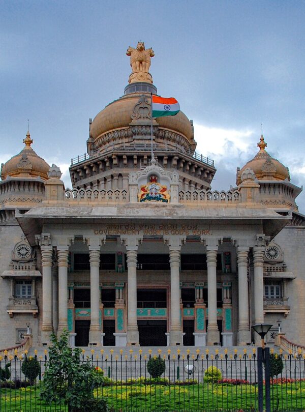 Continue to Vidhan Soudha, a grand architectural landmark often referred to as the “Taj Mahal of South India” because of its magnificent design and pristine white appearance. It is the largest legislative building in India. The architecture blends Dravidian, Rajasthani, South Indian, and Indo-Saracenic styles, and the structure is decorated with beautifully carved granite pillars, walls, and domes. The building is surrounded by well-maintained gardens, fountains, and colorful flowers, making it an impressive sight.